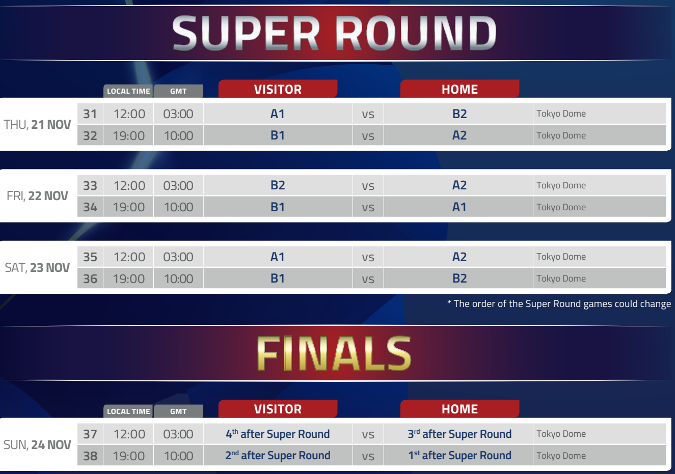 이번에 예매 일정이 공개된 경기는 11월 13일 일본 나고야 반테린 돔에서 열리는 일본-호주의 B조 개막전과 21∼23일 일본 도쿄 도쿄돔에서 열리는 슈퍼 라운드, 24일 도쿄돔에서 열리는 동메달 결정전과 결승전이다.